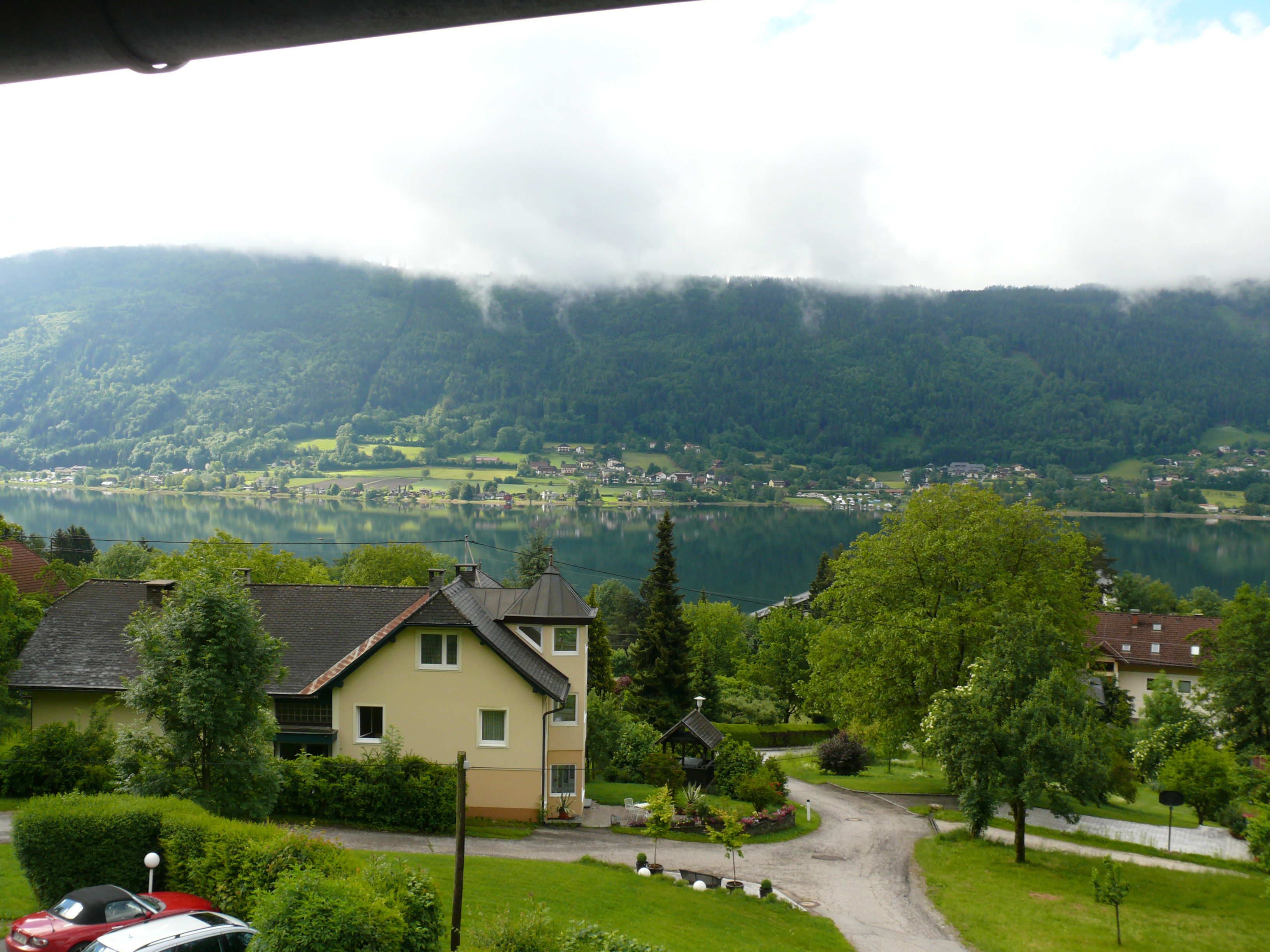 Hurra …. ich habe Bodensdorf am Ossiacher See erreicht und mein Navi führt mich zielsicher zum Hotel. Schöner großer Parkplatz und alles frei! Alles frei?? Mich beschleicht ein sehr ungutes Gefühl und dann stehe ich vor einer verschlossenen Türe. Ein Schild weist darauf hin, daß das Hotel bis Anfang Mai geschlossen ist. Heute ist der 31. Mai und meine Buchungsbestätigung per Mail für 3 Nächte mit Halbpension ist kein Argument, das diese Tür für mich öffnet. Bei näherem Hinsehen möchte ich auch nicht unbedingt bleiben. So muß ich nach 800 km Regenfahrt auch noch auf Zimmersuche gehen! Das erste Hotel ist mir zu teuer, das zweite will keine Hunde und das dritte ist ein Hauptgewinn! Ich habe tatsächlich eine überaus freundliche Familienpension mit moderaten Preisen und exzellenter Küche gefunden! Nach einer kurzen Gassi-Runde und einem leckeren 3-Gänge-Menü gehen wir ziemlich erschöpft schlafen.