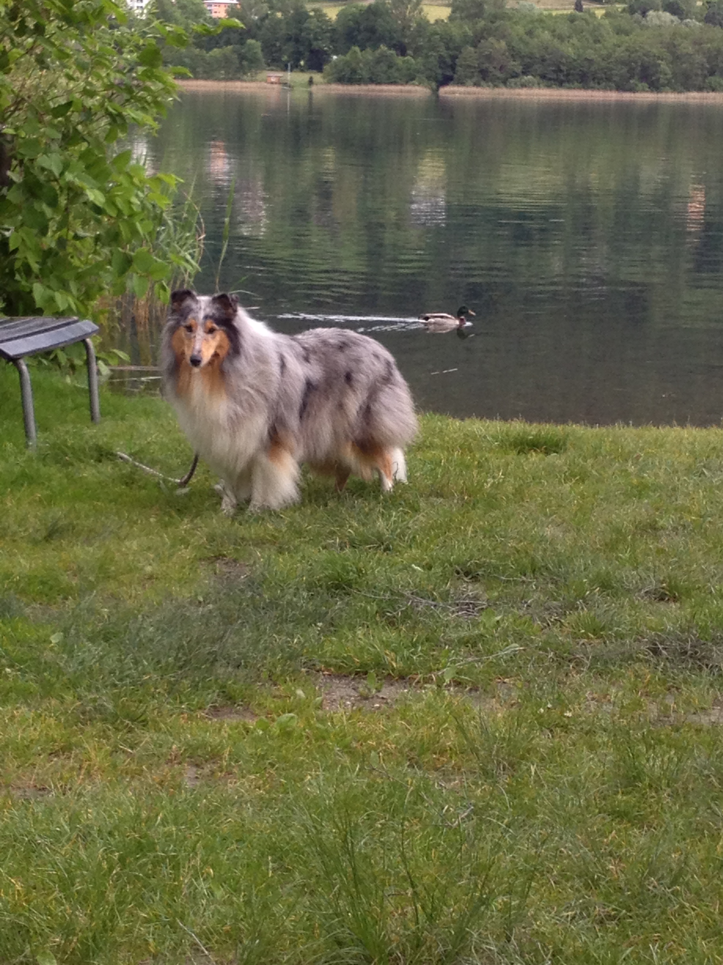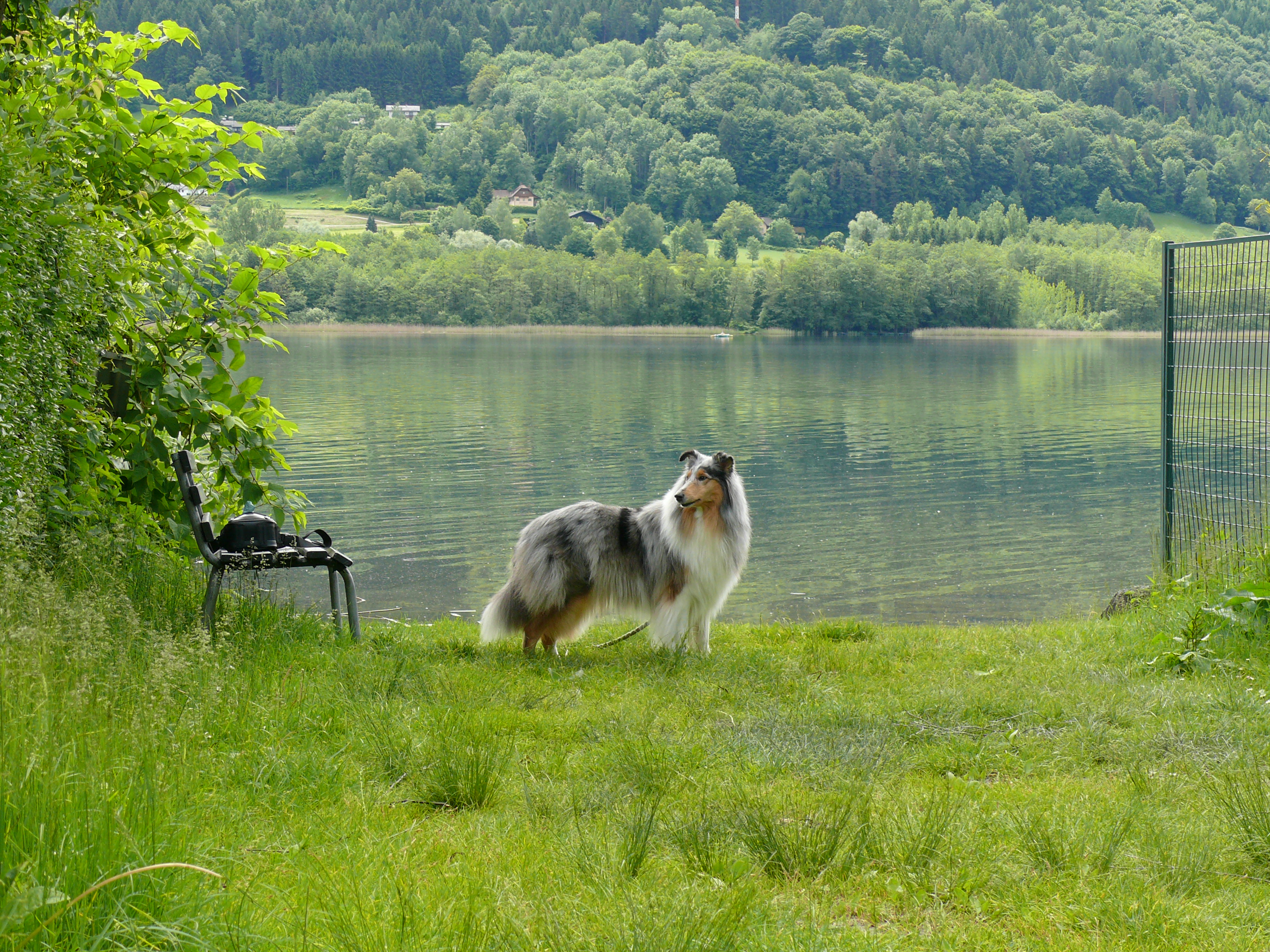 Frohgemut machen wir uns auf den Weg und finden tatsächlich den Bahnübergang. Der Uferweg heißt sogar so, nur vom Seeufer ist nichts zu sehen! Tolle Villengrundstücke liegen direkt am See und der Uferweg verläuft zwischen blickdichten Grundstücksgrenzen und dem Bahndamm. Betreten strengstens verboten …. so hatte ich mir das nicht vorgestellt. Lange gehen wir diesen Weg entlang, bis fast nach Bodensdorf. Wir treffen Jogger, Radfahrer, andere Hunde. Autos fahren dort auch. Es scheint die Gassimeile zu sein, denn ab und an stehen Sackerl bereit. Endlich finde ich einen öffentlichen Zugang zum See, genau 2 Meter breit und am Ende wartet eine Bank. Wir lassen uns dort nieder und genießen die Ruhe. Mit dem Handy schieße ich ein paar Fotos und eines ist gut genug, um in Facebook zu landen.