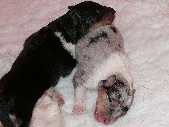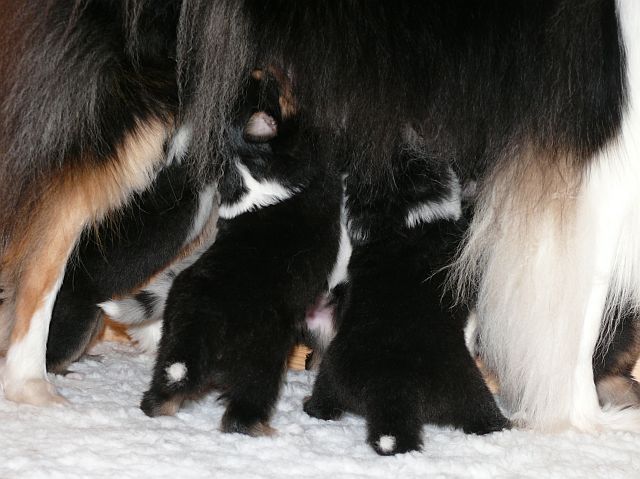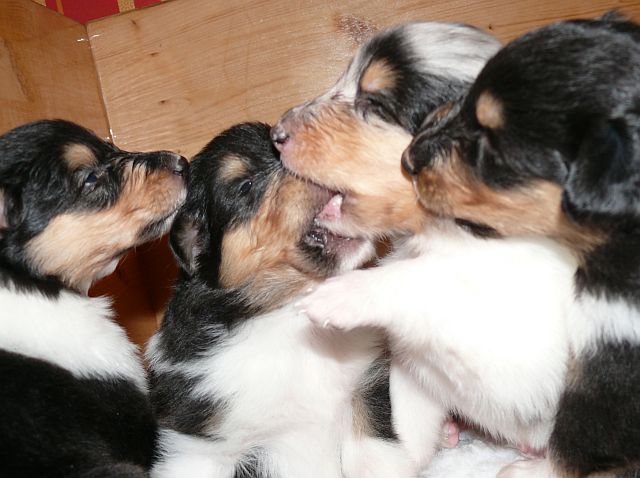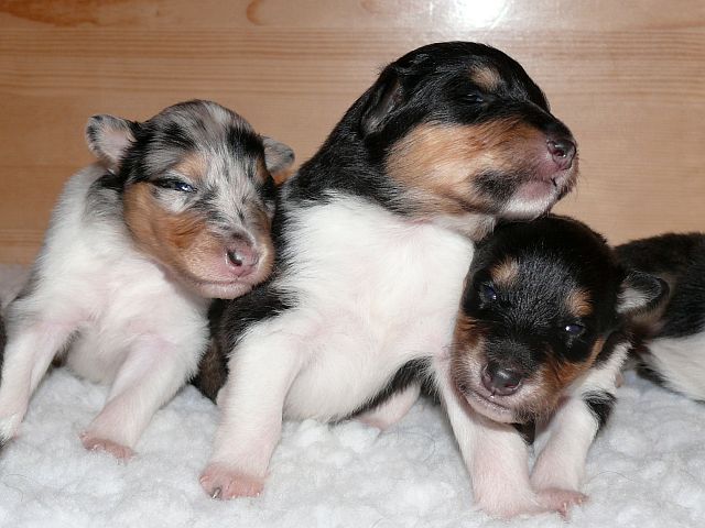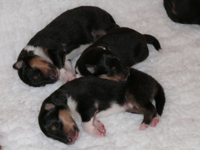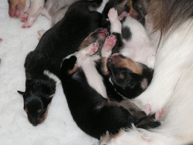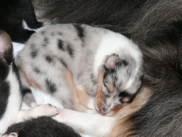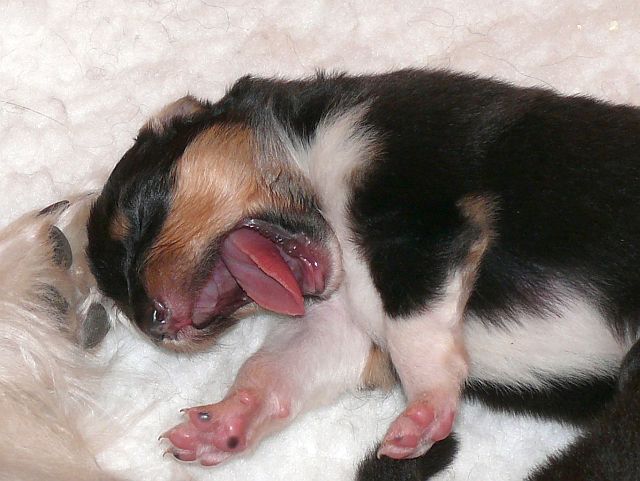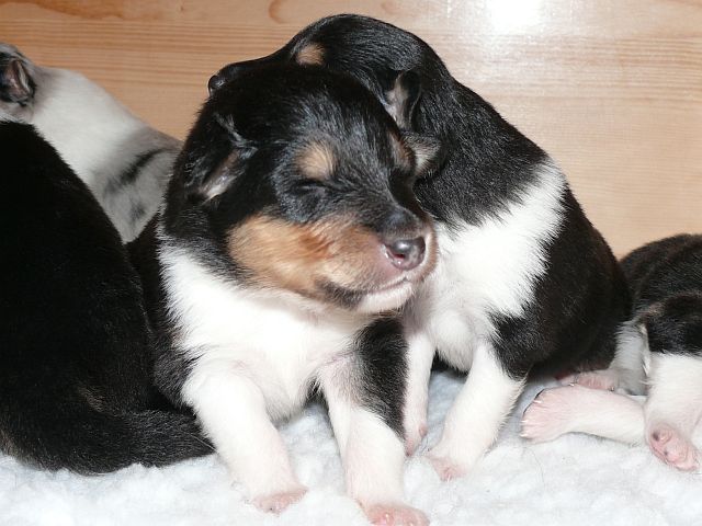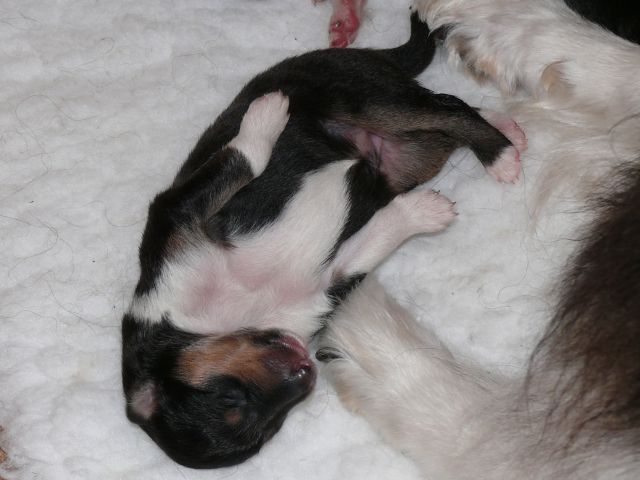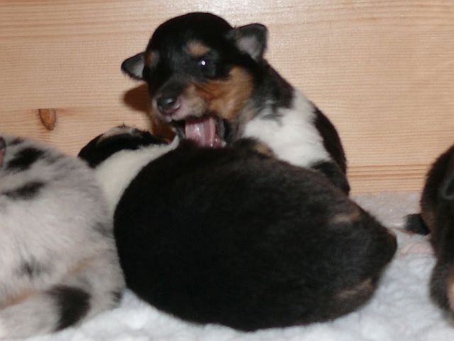 Nur 10 Minuten nach dem Hummelie wurde es dann endlich schwarz. Blau ist nämlich wirklich nicht Lucie’s bevorzugte Welpenfarbe. 332g Geburtsgewicht brachte die bezaubernde Trico-Lady mit auf die Welt und wir ahnten allmählich, warum Lucie so kugelrund durch die letzten Tage gegangen war. Unser „Tri-Girl“ ist absolut bezaubernd und schön gezeichnet. Sie hat sich zu einer kecken, selbstbewussten Dame entwickelt und ist immer die neugierigste im Wurf. Dieses Sahneschnittchen konnte nur einen Namen von uns bekommen: Liaison Eclair.