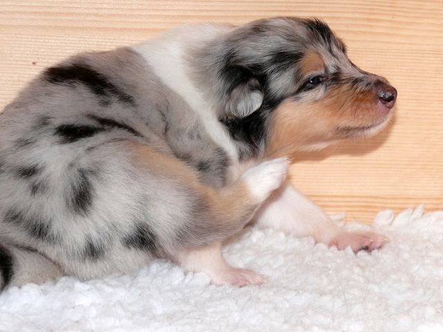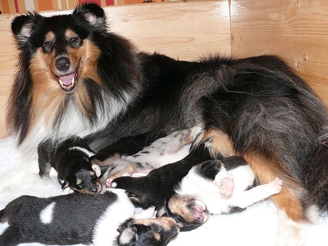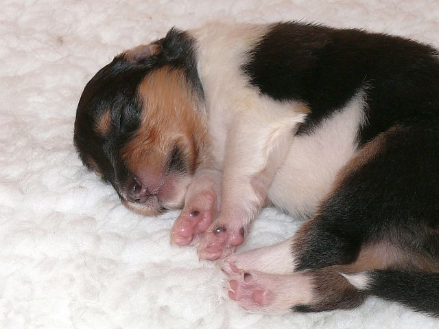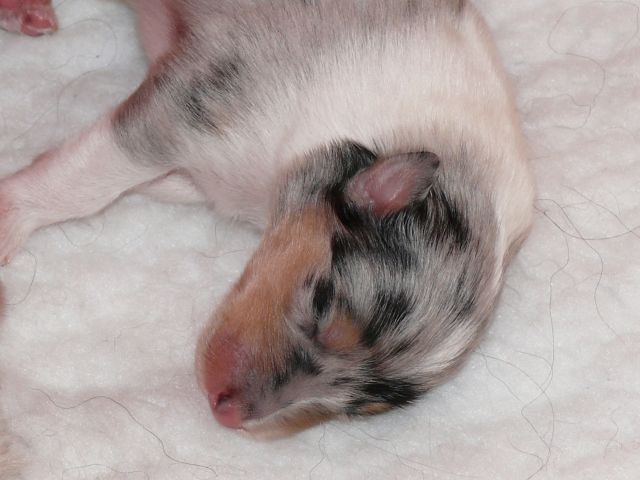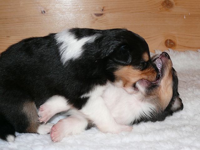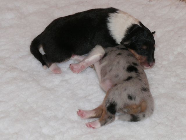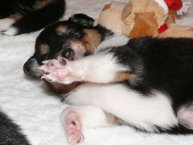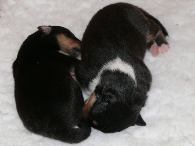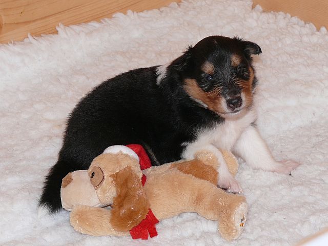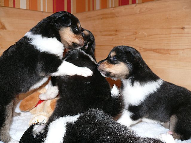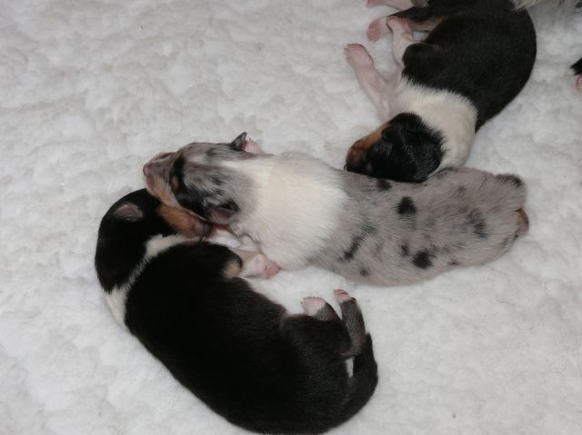 Nur 10 Minuten nach dem Hummelie wurde es dann endlich schwarz. Blau ist nämlich wirklich nicht Lucie’s bevorzugte Welpenfarbe. 332g Geburtsgewicht brachte die bezaubernde Trico-Lady mit auf die Welt und wir ahnten allmählich, warum Lucie so kugelrund durch die letzten Tage gegangen war. Unser „Tri-Girl“ ist absolut bezaubernd und schön gezeichnet. Sie hat sich zu einer kecken, selbstbewussten Dame entwickelt und ist immer die neugierigste im Wurf. Dieses Sahneschnittchen konnte nur einen Namen von uns bekommen: Liaison Eclair.